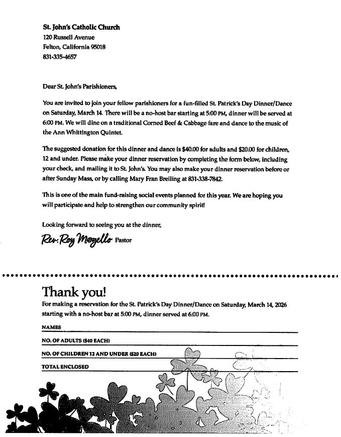 Make reservations after Mass, online on the St. John website by clicking on the Donate button or by calling Chair, Mary Fran Breiling at 831-338-7842.